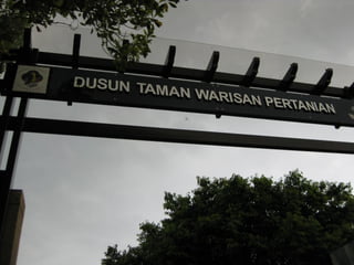 The Warisan Factory Tour. At the Agriculture Heritage Park Taman Warisan Pertanian in Putrajaya Malaysia there is an extensive orchard with a wide variety of tropical fruit trees along with information. Taman Warisan Pertanian and Putrajaya Landmark.